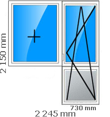 Размеры: общая высота 2 150 мм, общая ширина 2 245 мм, ширина двери 730 мм.